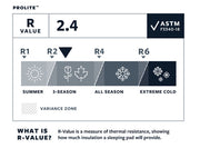 ProLite har R-verdi på 2.4. Liggeunderlaget kan brukes på vår, sommer og høst. R-verdien til Therm-a-Rest er bygget på ASTM-standarden som kom i 2020. Denne standarden er utviklet av blant andre Therm-a-Rest og er den første universale standarden for R-verdi. Dette er et selvoppblåsende liggeunderlag på 2,5 cm tykkelse med et ripstop stoff som er ekstra slitesterkt.