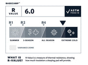 BaseCamp har R-verdi på 6.0. Liggeunderlaget kan brukes hele året. LuxuryMap har vært brukt mye på ekspedisjoner på vinteren, til seilturer i båt og selvfølgelig en masse på teltturer. R-verdien til Therm-a-Rest er bygget på ASTM-standarden som kom i 2020. Denne standarden er utviklet av blant andre Therm-a-Rest og er den første universale standarden for R-verdi. Dette er et selvoppblåsende liggeunderlag på 5 cm tykkelse som gjør det komfortabelt å sove på.